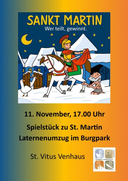 Am Martinstag, 11.11.2025, findet um 17:00 Uhr das Spiel zum Hl. Martin an der Kirche statt. Anschließend findet der Laternenumzug, begleitet von der Feuerwehrkapelle, durch den Burgpark statt.