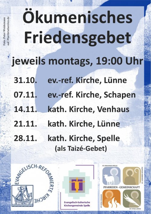 Auch in den nächsten Wochen wird es in unseren vier Gemeinden ökumenische Friedensgebete geben, zu denen wir herzlich einladen (s. Bild).