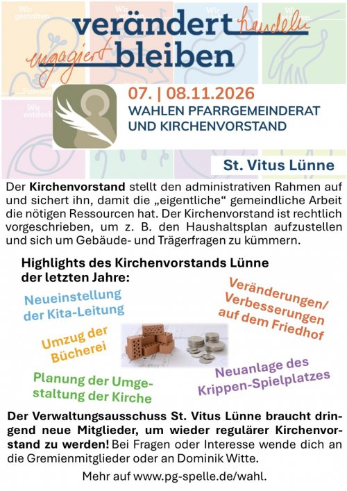 Im Lünner Pfarrgemeinderat und Kirchenvorstand (Verwaltungsausschuss) scheiden mit der Wahl viele Personen aus. Große Maßnahmen wie die Teilumnutzung der Lünner Kirche sind auf dem Weg und zukunftsweisende Entscheidungen für die pastorale Arbeit stehen an.