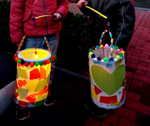 Als St. Martin die Straße entlangritt, schlossen sich ihm viele Kinder mit ihren bunten Laternen an und zogen gemeinsam zum Kolpingplatz, wo im Anschluss die Martinsaufführung stattfand.