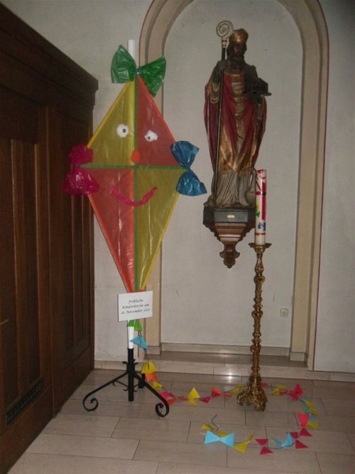 Herbstlich ging es bei der "Fröhlichen Kinderkirche" am 18. November zu. Denn passend zur Jahreszeit wurde diesmal ein großer Drache von den Kindern geschmückt. Dieser Drache war vorher im Kindergarten gebaut worden, und während der "Fröhlichen Kinderkirche" befestigten die Kinder Schleifen, auf denen ihr Name stand, an den Schwanz des Drachen. Ähnlich wie die Schleifen mit den Namen der Kinder am Drachen befestigt sind, gehören auch wir zu Gott. Gott will nicht allein sein - er möchte unser Freund sein und uns bei sich haben!
